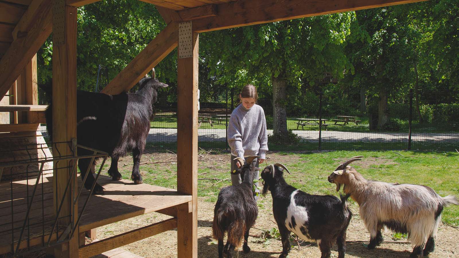 Feddet Strand Resort er et fantastisk sted at være, hvis man er glad for dyr. Her findes den lille dyrefold, hvor bl.a. gederne Ea, Erik, Emma, Eilif og Ellen bor.